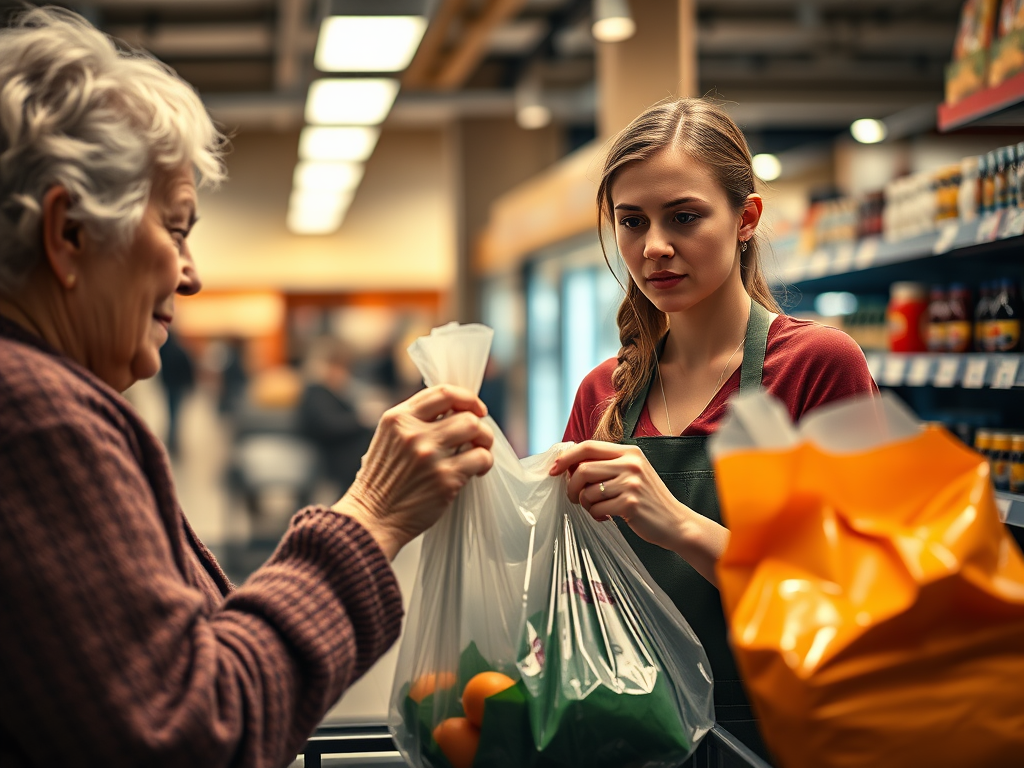 Φανταστική ανταλλαγή στο ταμείο του σούπερ μάρκετ: μια ηλικιωμένη κυρία διαλέγει μια πλαστική σακούλα για να βάλει μέσα τα ψώνια της.