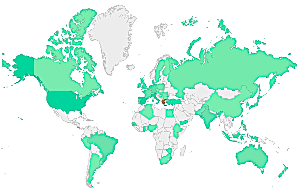 GRΕλλάδα, ITΙταλία, ESΙσπανία, USΗνωμένες Πολιτείες, DEΓερμανία, TRΤουρκία, INΙνδία, BRΒραζιλία, IDΙνδονησία, FRΓαλλία, AUΑυστραλία, BAΒοσνία – Ερζεγοβίνη, YEΥεμένη, PKΠακιστάν, CRΚόστα Ρίκα, RUΡωσία, GBΗνωμένο Βασίλειο, BGΒουλγαρία, CHΕλβετία, CAΚαναδάς, IEΙρλανδία, ROΡουμανία, EGΑίγυπτος, NLΚάτω Χώρες, NZΝέα Ζηλανδία, NGΝιγηρία, PLΠολωνία, UYΟυρουγουάη, ZAΝότια Αφρική, JPΙαπωνία, BEΒέλγιο, KRΝότια Κορέα, BJΜπενίν, CYΚύπρος, GHΓκάνα, HUΟυγγαρία, TWΤαϊβάν, PTΠορτογαλία, CNΚίνα, CEΣουηδία, PHΦιλιππίνες, ETΑιθιοπία, DKΔανία, ZWΖιμπάμπουε, ILΙσραήλ, ARΑργεντινή, PEΠερού, HKΧονγκ Κονγκ ΕΔΠ Κίνας, DZΑλγερία, SGΣιγκαπούρη, RSΣερβία, MKΒόρεια Μακεδονία, CZΤσεχία, ATΑυστρία, CNΣενεγάλη, RWΡουάντα, KEΚένυα, FIΦινλανδία,